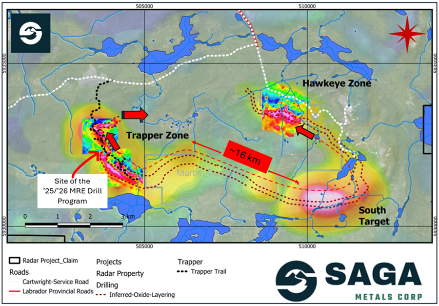 Figure 6: Radar Project’s prospective oxide layering zone validated over about 16 km strike length through Fall 2025 drilling, as shown on a compilation of historical airborne geophysics as well as ground-based geophysics in the Hawkeye and Trapper zones completed by SAGA in the 2024/2025 field programs. SAGA has demonstrated the reliability of the regional airborne magnetic surveys after ground-truthing and drilling in the 2024 and 2025 field programs.