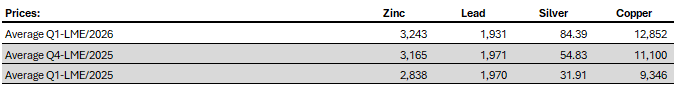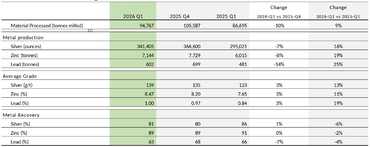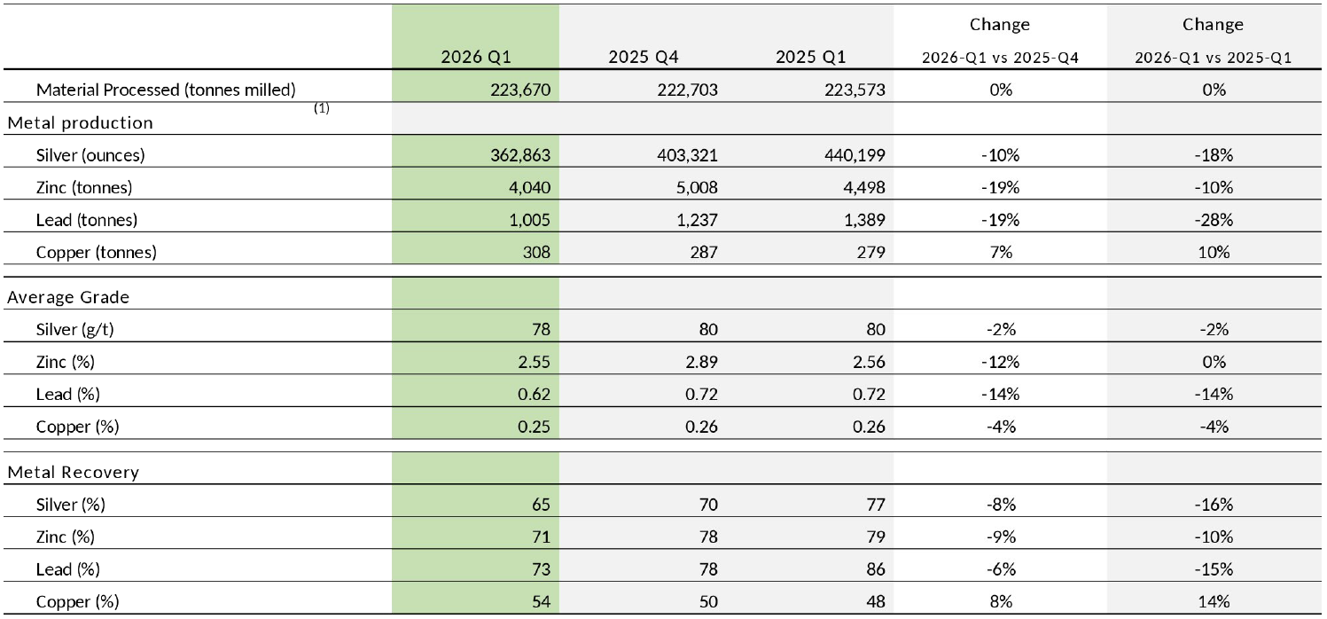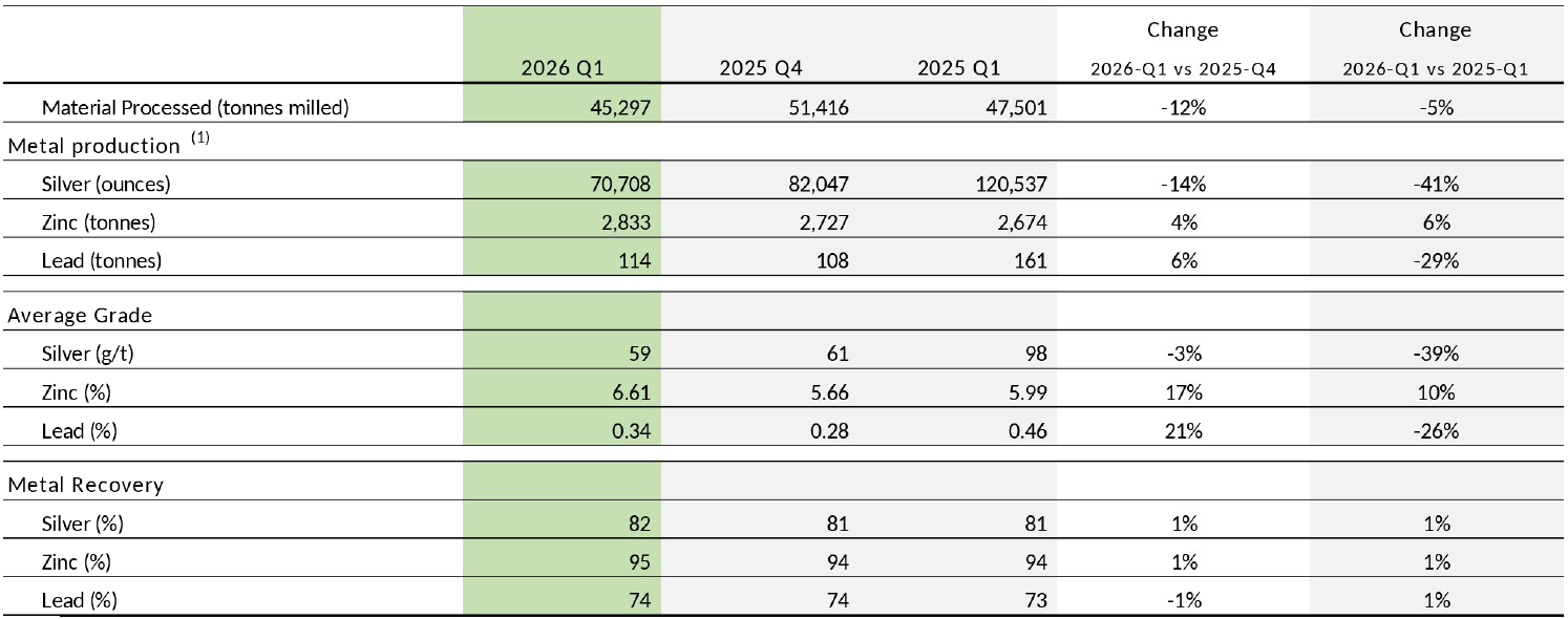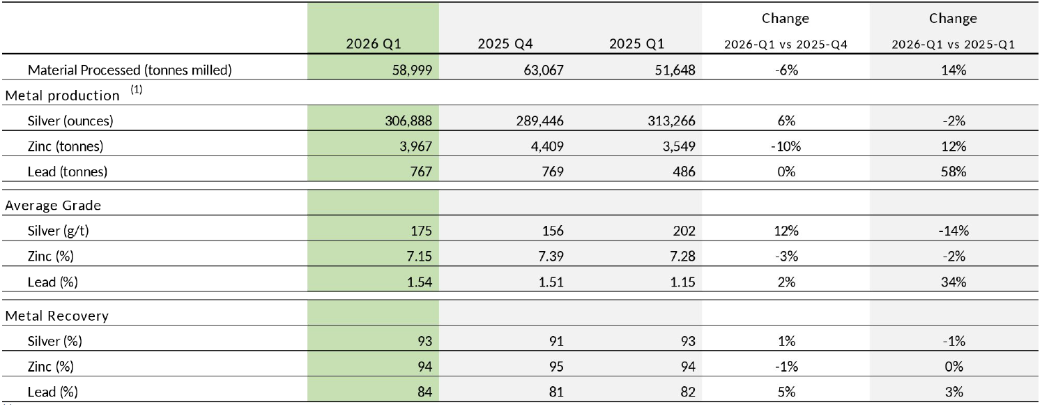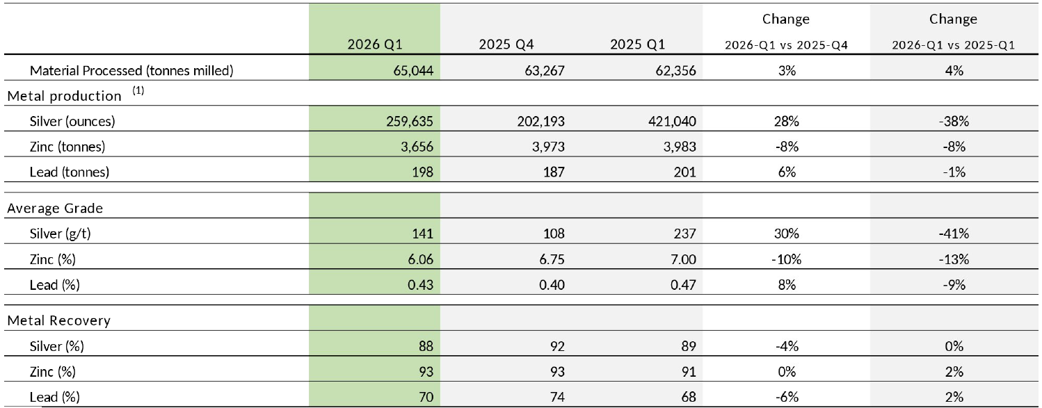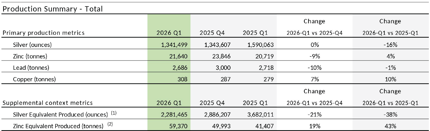 Commencing Q1 2026, the Company has improved its production disclosure by reporting Zinc Equivalent tonnes produced and has changed the method of calculating Silver Equivalent Ounces produced. The Company considers silver equivalent ounces and zinc equivalent tonnes to be useful supplemental production metrics for evaluating its multi-metal production profile. These measures are commonly used in the mining industry as reference metrics to facilitate period-over-period comparisons and, where relevant, benchmarking against industry peers. They should be viewed as supplemental to, and not a substitute for, the actual metal production volumes disclosed on a metal-by-metal basis.