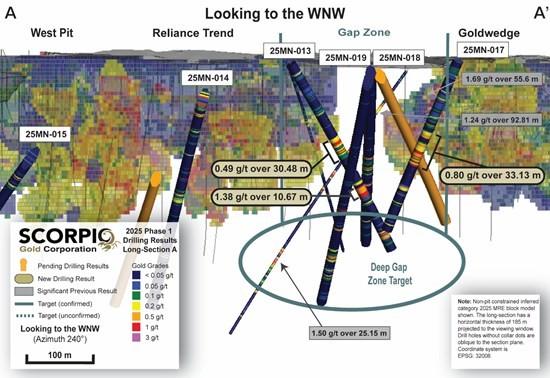 Diamond drill hole 25MN-013 tested the Gap Zone from the northeast side of the West Pit, and returned 0.49 g/t gold over 30.48 m from 122.22 m; 1.27 g/t gold over 14.75 m from 194.95 m, including 1.81 g/t gold over 5.85 m from 203.85 m; and 1.38 g/t gold over 10.67 m from 260.60 m (see Table 1).