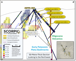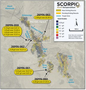 Scorpio Gold Corp. (TSX-V: SGN) (OTCQB: SRCRF) (FSE: RY9) is pleased to announce results from five step-out holes of the Phase Two drill program at the Manhattan District Project, Nevada, USA: 26MN-059 through 26MN-063, see Figure 1. The results are tabulated in Table 1 and discussed below. Scorpio Gold has drilled 72 drill holes to date from its Phase Two diamond drilling program, 25MN-011 through 25MN-045, 26MN-046 through 26MN-077, 26MN-079, and 26MN-081, for a grand total of 20,518 m. With the results herein, Scorpio Gold has reported assays on 48 of these (25MN-011 through 25MN-045 and 26MN-046 through 26MN-063), totalling 17,393 m, and assays are pending from 16 holes (26MN-064 through 26MN-077, 26MN-079, and 26MN-081), totalling 3,125 m. The pending results will be reported as they become available.