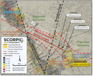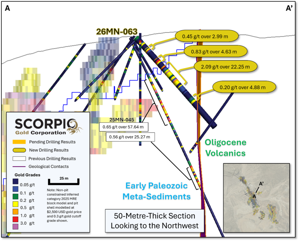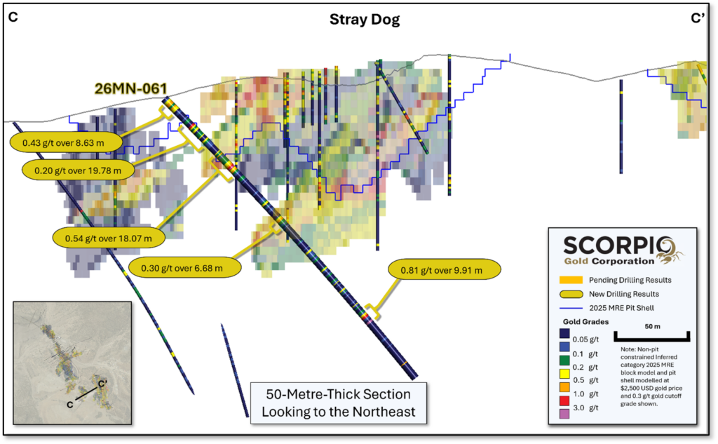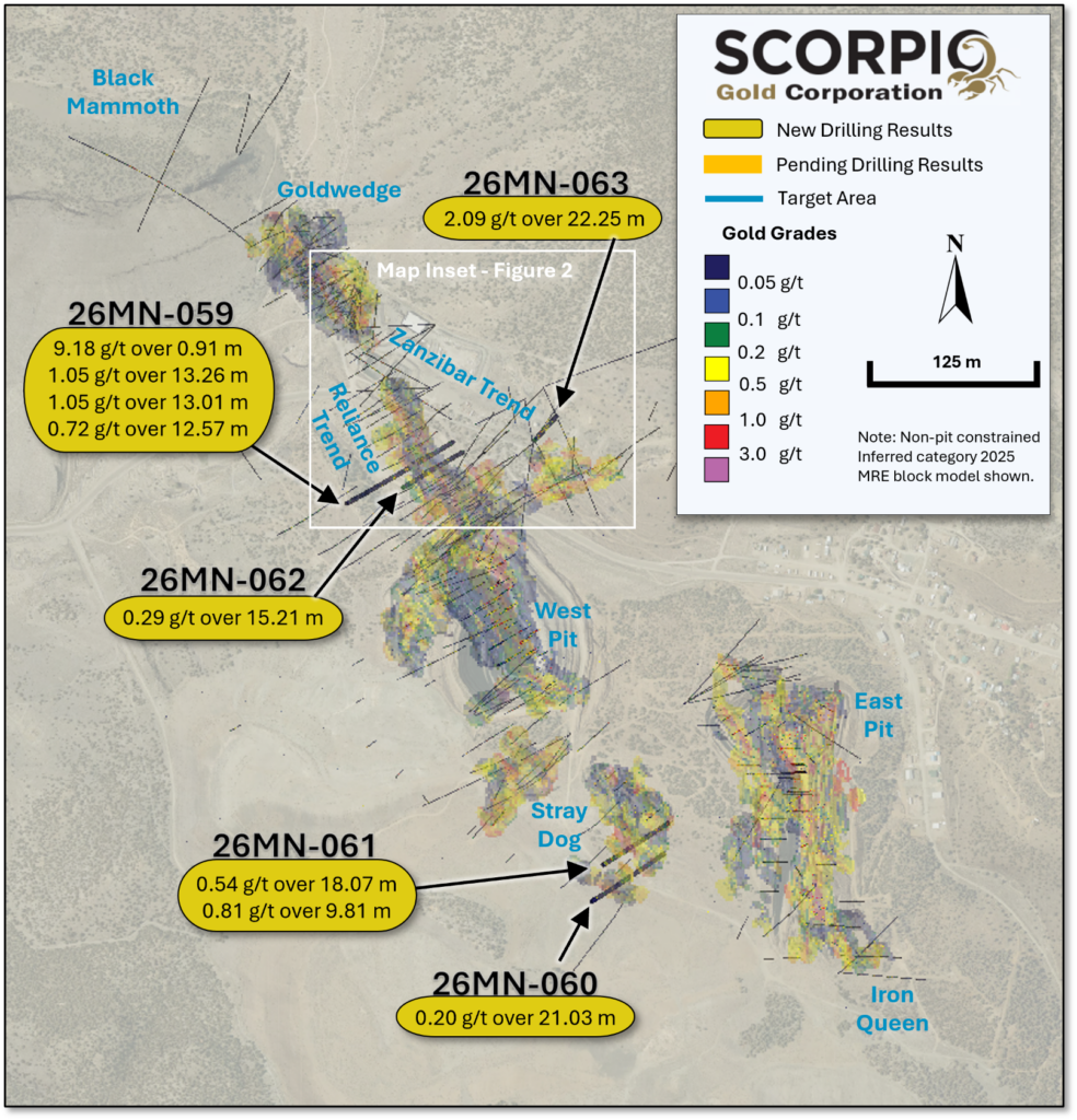 Drill hole 26MN-063 was drilled along the Zanzibar Trend as ~50 m step-outs to both holes 25MN-044 and 25MN-045, see news release dated February 19, 2026, see Figure 2. Drill hole 26MN-059 is a 50 m step-out to the southwest, along the Reliance Trend, to hole 25MN-026, see news release dated November 24, 2025. Drill hole 26MN-062 is a 50 m step-out to the northwest, along the Reliance Trend, to hole 26MN-047, see news release dated February 27, 2026. Two drill holes, 26MN-061 and 26MN-062, drilled at Stray Dog, stepping out from the historic USD Pit. All the drill holes tested beyond the Inferred Resource Constraining Pit, see Figure 4. Step-out drill holes targeted non-pit constrained inferred category mineralization and uncategorized mineralization. For further details see “Mineral Resource Estimate and NI 43-101 Technical Report, Manhattan Property, Nye County, Nevada” with an effective date of June 4, 2025, on Scorpio Gold’s website at https://wp-scorpiogold-2025.s3.ca-central-1.amazonaws.com/media/2025/10/Scorpio-Gold-Manhattan-Mineral-Resource-Estimate-43-101-FINAL-2025-10-23.pdf.