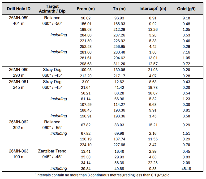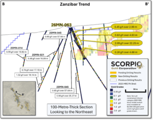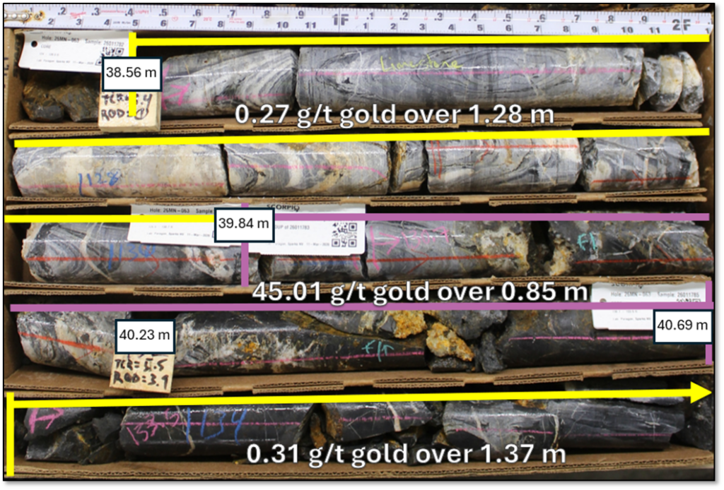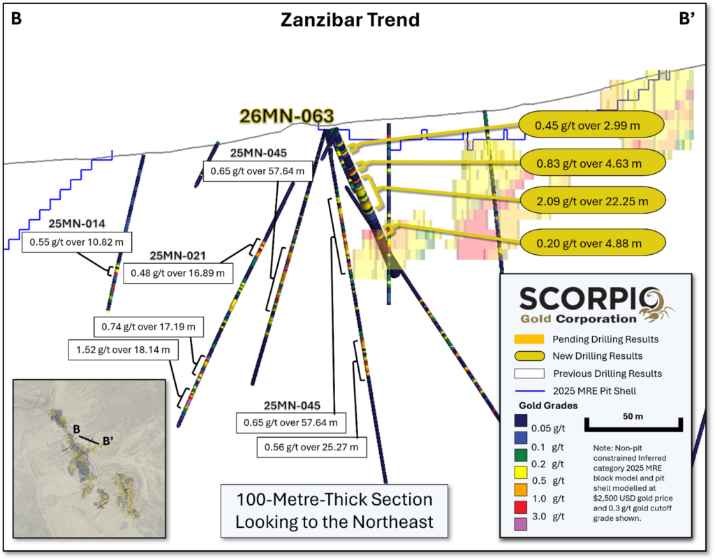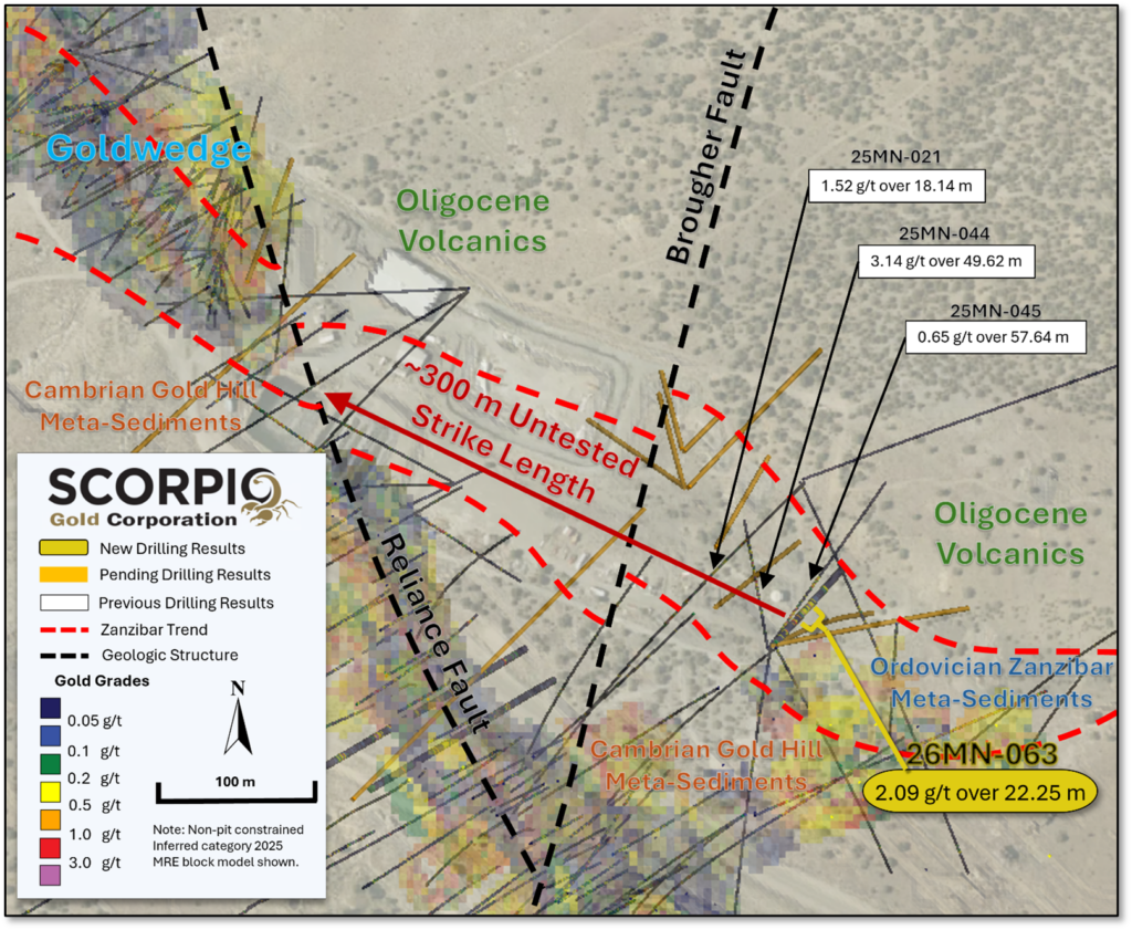 “The Zanzibar Trend has quickly emerged as a priority-one target for the Company, representing a newly defined zone that splays off the main Reliance structure. Surface mineralization first demonstrated in hole 25MN-044, which returned 3.14 g/t gold over 49.62 metres, has now been successfully followed up with a step-out to the southeast along a 700-metre largely untested strike corridor extending from Goldwedge to Mustang Hill. Drill hole 26MN-063 further demonstrates continuity along the trend, particularly along the eastern limb of the Manhattan Anticline. As a splay off the principal structural corridor and with limited historical testing, we believe this trend has significant potential to be additive to the existing resource base, supported by the presence of promising grades encountered to date. We continue to allocate focused drilling to this area, with one of our three active rigs currently dedicated to advancing the Zanzibar Trend,” stated Harrison Pokrandt, VP Exploration of Scorpio Gold.