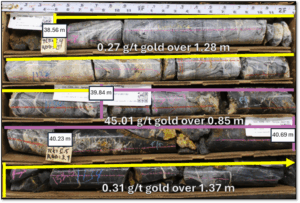26MN-063: This drill hole tested the Ordovician Zanzibar Formation and associated mineralization, as it trends from the southeast of Goldwedge towards Mustang Hill. The drill hole contains three intervals hosted in Ordovician Zanzibar Formation limestones and fine grained meta-sedimentary units, including 0.45 g/t gold over 2.99 m from 13.41 m, 0.83 g/t gold over 4.63 m from 25.30 m, and 2.09 g/t gold over 22.25 m from 34.14 m; including 45.19 g/t gold over 0.85 m from 39.84 m (see Figure 3). The latter interval represents new mineralization outside the current IRCP, see cross-section A to A’ (Figure 4) and cross-section B to B’ (Figure 5).