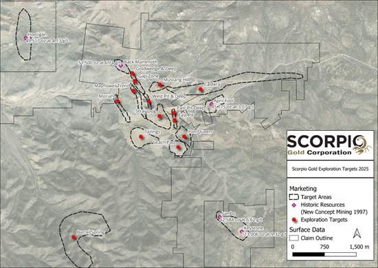 | Keystone Jumbo | The historic high-grade Keystone and Jumbo pits lie ~5 km to the SE of the main MRE area. Geology of the area is comprised of fine-grained clastic sediments, breccias, a felsic stock, and sills and dikes with extensive brecciation. Mineralization is classic low sulphidation epithermal type, with extensive drusy quartz, carbonate textures in veins, and breccia fill with pyrite and its oxidation products and associated clays. Mineralization appears to be focused along a north trending fault system. Free gold is hosted mainly in quartz along the walls of kaolinized faults. The area notes boundaries between Roberts Mountain Thrust/Cretaceous Intrusive/Manhattan Anticline. | Keystone and Jumbo were previously mined open pits (1970s). Previous Scorpio management completed a preliminary phase of drilling at the target in 2019 but did not follow up with the indicated follow-up phase of drilling (see news release dated December 6, 2019). Estimated 156k oz Au (7.64 g/t) historic resource (New Concept, 1997 – see Technical Report effective June 4, 2025). See Figure A2 (Appendix A). | Data compilation work, develop geological model and target Historic Resource area and extensions. Existing Plan of Operations with USFS needs updated bonding prior to commencing drilling activities. |