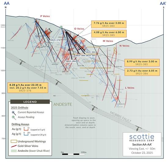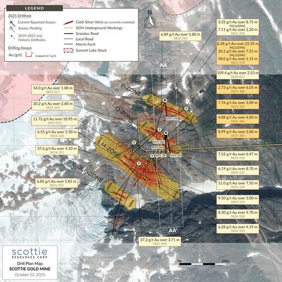 Scottie Resources Corp. (TSX-V: SCOT) (OTCQB: SCTSF) (FSE: SR80) is pleased to report new assays from its 2025 drilling of the P-Zone within the Scottie Gold Mine Project. The road-accessible Scottie Gold Mine Project, which includes the 100%-owned past-producing Scottie Gold Mine and the adjacent Blueberry Contact Zone, is located 35 kilometres north of Stewart, BC, and is the subject of a newly released Preliminary Economic Assessment (see news releases dated October 28, 2025).
