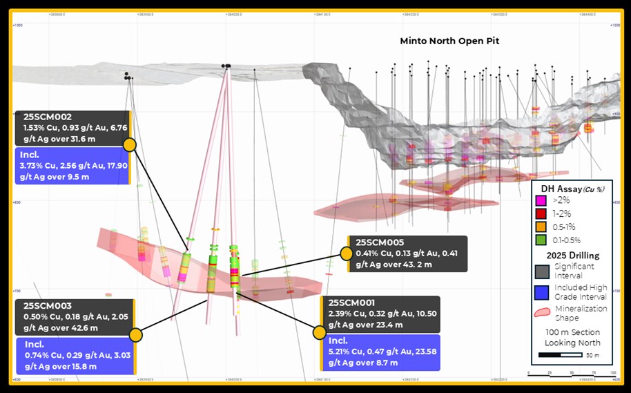 Selkirk Copper Mines Inc. (TSX-V: SCMI) (FSE: IO20) is pleased to announce assay results from the first four drill holes of the 50,000 m program, which strategically test the size and continuity of the high grade Minto North West Zone with highlights from drill hole 25SCM001 of 2.39% Cu, 0.32 g/t Au and 11.61 g/t Ag over 23.4 meters, including a higher grade core of 5.21% Cu, 0.47 g/t Au and 26.68 g/t Ag over 8.7 meters, and from drill hole 25SCM002 of 1.53% Cu, 0.93 g/t Au and 6.76 g/t Ag over 31.6 meters from hole 25SCM002, including a higher grade core of 3.73% Cu, 2.56g/t Au and 17.90g/t Ag over 9.5 meters.