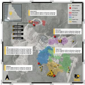 • 5.21% Cu, 0.47 g/t Au, 26.68 g/t Ag over 8.7 m from 228.85 m, within a broader zone of 2.39% Cu, 0.32 g/t Au and 11.61 g/t Ag over 23.4 m in drill hole 25SCM001