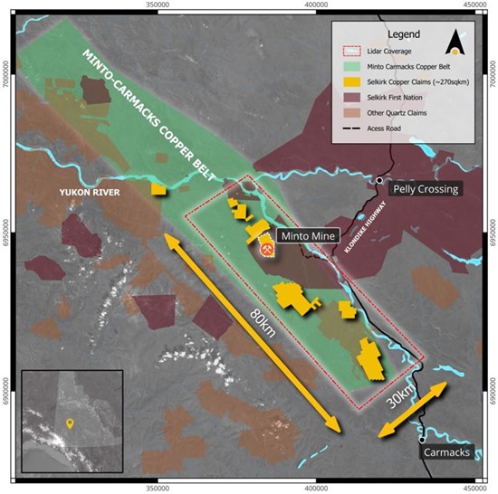 Regional map of the Minto-Carmacks Copper Belt, showing the extent of the 2025 LiDAR survey (red rectangle).