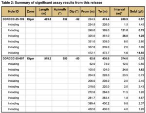 Drilling at the Eiger in 2025, which included 10 holes for 4,401 meters, was successful in extending the known mineralization at the Eiger deposit. Drilling intersected reduced intrusion-related gold style mineralization including centimetre scale quartz veins with visible gold often associated with bismuthinite, arsenopyrite, and occasionally scheelite and extended mineralization to the east, west, and down dip. The current mineral resource estimation at Eiger is 440,000 ounces of gold in 27,362,000 tonnes grading 0.50 g/t gold in an inferred category. Recently completed drilling at Eiger, including the 121.0 m of 0.75 g/t Au from 248.0 m and 26.0 m of 1.28 g/t Au from 325.0 m intercepted in DDRCCC-25-109, suggest a higher-grade component to the deposit could be emerging at depth, which is a characteristic of the more advanced Blackjack deposit located 1.5 km to the west. The Eiger deposit remains open in all directions.