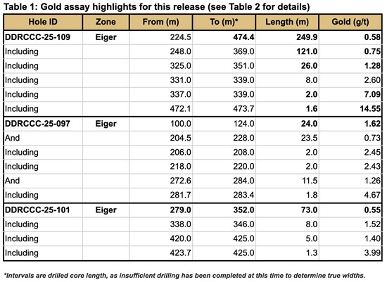 Figure 2: A cross section of the Eiger Deposit showing the location of DDRCCC-25-109 which returned 121.0 metres of 0.75 g/t gold and 26.0 metres of 1.28 g/t gold within 249.9 metres of 0.58 g/t gold, intercepted 325 metres beyond the current MRE boundary. These results underscore the potential to add significant ounces to the Eiger deposit and suggest a higher-grade component appears to be developing at depth.