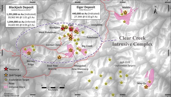 Figure 7: A plan map of the Clear Creek Intrusive Complex showing the updated resource areas at Blackjack and Eiger, along with the newly discovered Rhosgoble zone and several other high-priority drill targets and multiple exploration targets. . The map highlights the numerous drill targets that Sitka has outlined within the CCIC which all are connected by the road network on the project and occur in an area measuring five (5) km north-south and twelve (12) km east-west. Additional areas highlighted by strong gold in soil anomalies are being advanced to the drill ready stage with additional geological work in 2025.