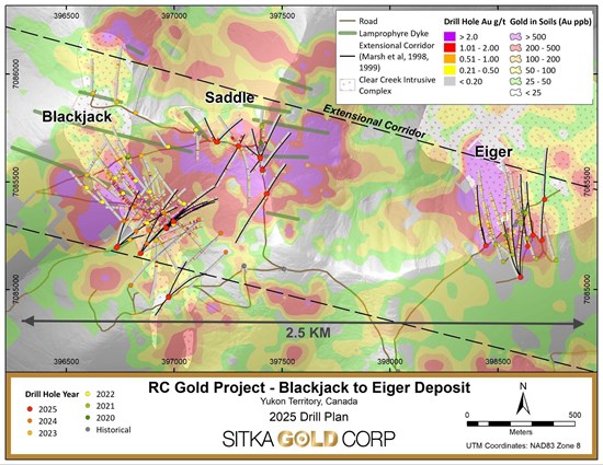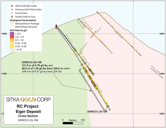 Sitka Gold Corp. (TSX-V: SIG) (FSE: 1RF) (OTCQB: SITKF) is pleased to announce additional analytical results from drilling completed at its 100% owned, road accessible RC Gold Project located within the Yukon’s prolific Tombstone Gold Belt. Drilling at the Eiger gold deposit has expanded the mineralized envelope beyond the current MRE boundary, with drill hole DDRCCC-25-109 intersecting 121.0 m of 0.75 g/t gold and 26.0 m of 1.28 g/t gold within 249.9 m of 0.58 g/t gold from 325.0 m outside of the current MRE. Analytical results are currently pending for 38 drill holes at RC Gold, including 26 from the new Rhosgobel discovery and the remainder from Pukelman, Contact, Bearpaw, and May-Qu.