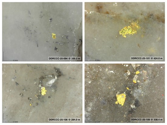 * While visible gold observations are very encouraging and confirm the presence of gold mineralization, they are not intended to imply potential gold grades. Gold assays will be published after they are received from the lab for mineralized intervals in which visible gold particles were noted.