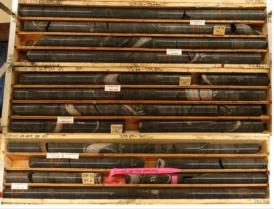 Figure 6: Core from DDRCCC-25-109 of sheeted quartz veins in diorite showing part of the 26.0 m interval of 1.28 g/t Au, including 2.0 m of 7.09 g/t Au from 337.0 m.