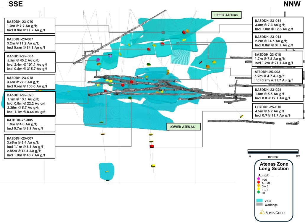Soma’s Vice President of Exploration, Chris Buchanan, stated, “The Atenas Zone, located at the southern end of the Cordero Deposit, has been a key focus of our drilling efforts to support mining operations by increasing contained gold ounces and improving confidence in the resource. The current drill results have exceeded our expectations for the zone and returned some of the highest-grade assays in the deposit. We’re excited to continue exploring the high-grade shoot that is developing in the upper portions of the vein set.”