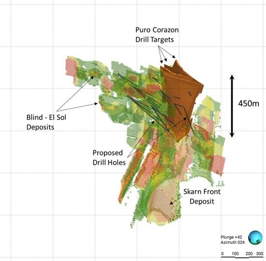 Figure 2: Projected Puro Corazon drill targets within the Skarn Front and Blind-El Sol block models with proposed the drill pattern for Q4 drilling on the Puro Corazon claim