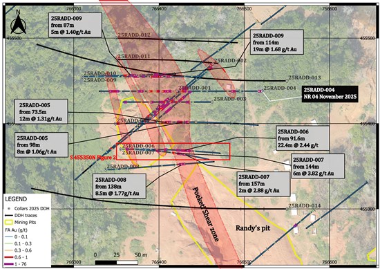 The higher-grade intercepts reported in this release indicate that there is vertical and lateral continuity of the gold mineralization. The drilling completed to date supports the Company’s developing structural model of high-grade shoots within the north-north-west trending Poeketi shear corridor. The 19-metre interval in drill hole 25RADD-009 (see Figure1) is especially important as it represents an additional wide zone of continuous mineralization that is north of Randy’s pit.