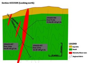These new drill results continue to intersect multiple mineralized intervals within a wider shear corridor with zones of higher-grade mineralization. There is consistent mineralization within the upper and mid-levels of this west dipping shear system that support continuity between earlier holes and the holes reported in this release. A strong, broad interval is recognized in a central mineralized corridor that is trending along strike from the initial high-grade intercept in 25RADD-004 (see NR dated 04 November 2025).