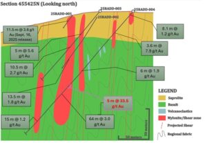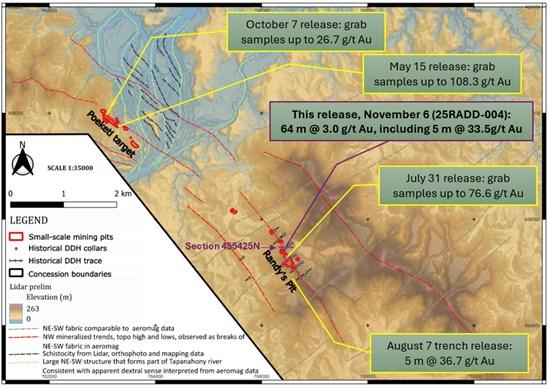 Dr. Dennis LaPoint, EVP of Exploration and Corporate Development, commented: “These impressive intercepts are the result of careful geologic and logging observations by Sranan Gold and are the first holes in the evaluation of this significant gold system. The results of hole 25RADD-004 are truly impressive. We will continue to delineate the deformation history and geometry of this major structurally-controlled gold system as we extend drilling along strike and at depth. Drilling has not yet tested below the Randy’s Pit nor the extensions seen in trenching.”