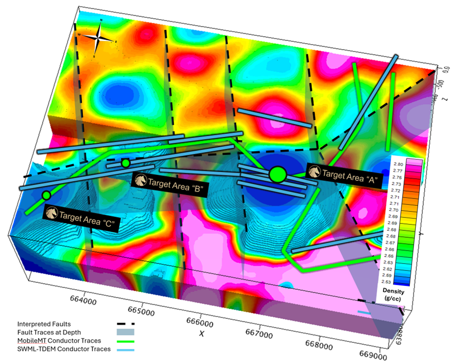 To further constrain the geometry and continuity of the conductive features, a joint inversion incorporating Ground TEM and larger-scale MobileMT data was undertaken by Computational Geosciences Inc. This approach was critical in refining conductor trends, as it is not limited by the thin-plate assumption inherent in the Maxwell plate modelling workflow. The joint inversion augments the plate modelling by allowing for curvilinear conductor geometries and improved definition of strike extents. Notably, a break in the main conductor trend is observed coincident with a density high in the gravity model, indicating a likely structural control on conductor development and continuity.