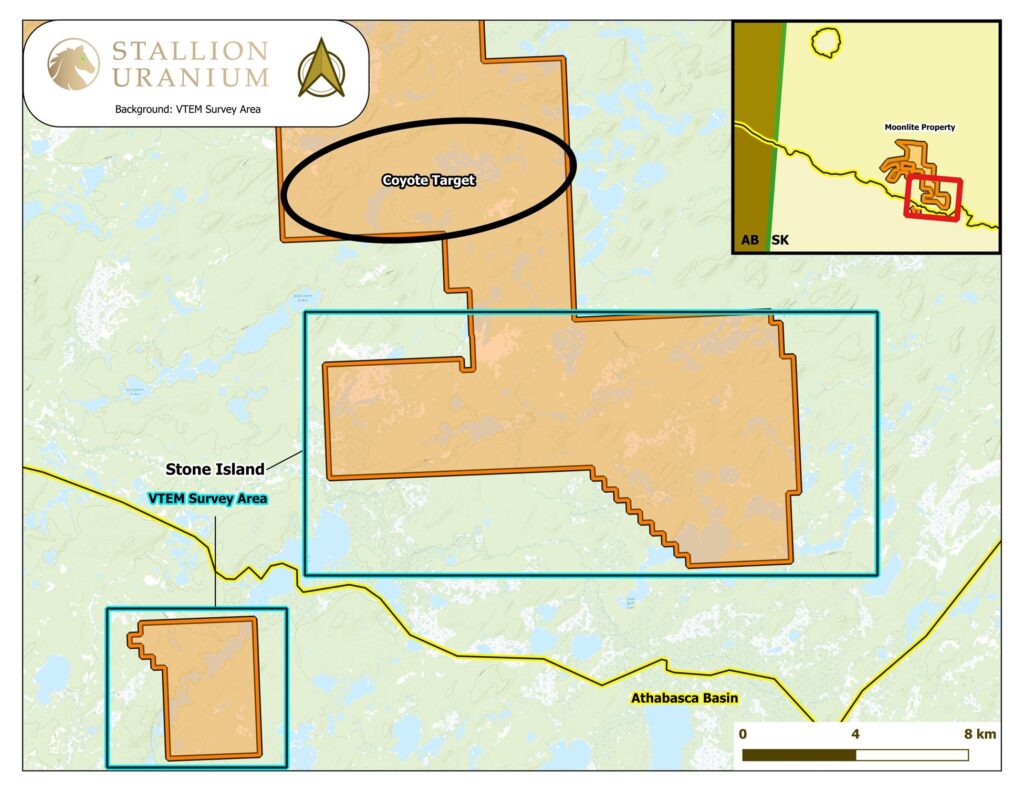 Stallion Uranium has commenced mobilization of a helicopter-borne VTEM™ Plus (Versatile Time Domain Electromagnetic) geophysical survey over the Stone Island Target at its Moonlite Project in the eastern Athabasca Basin, Saskatchewan. Mobilization of the survey began on January 6, 2026, marking the first geophysical survey conducted by the Company on the Moonlite Project since the claims were staked.
