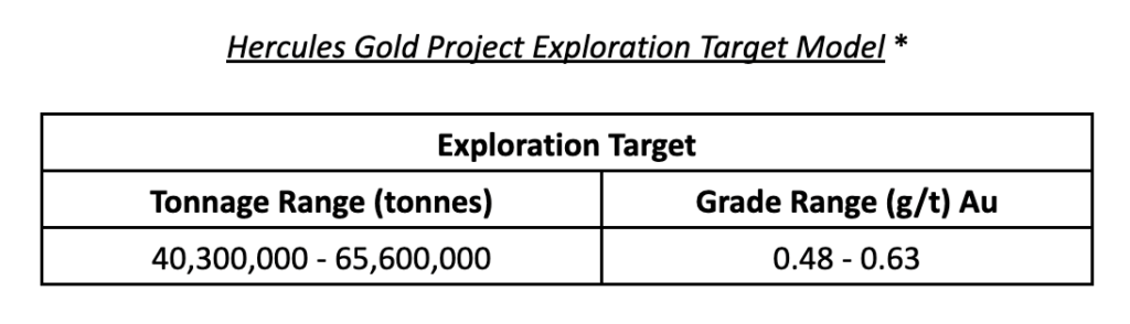 The Hercules Gold Project features an Exploration Target, as defined by NI 43-101, as follows: