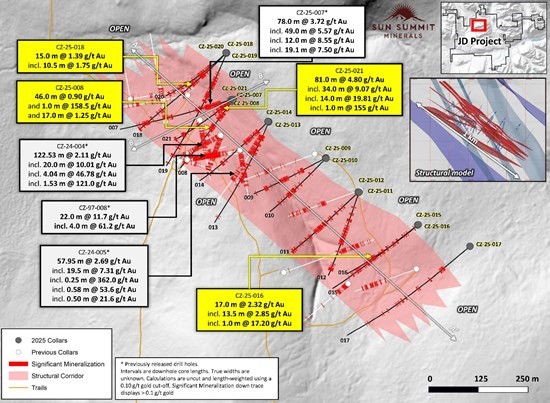 “We are pleased to announce very exciting new drill results from the 2025 program on the Creek Zone. The 2025 program was successful in demonstrating large intervals of near-continuous gold and silver mineralization in the near surface portion of the Creek Zone, highlighting high-grade gold in veins, while also identifying important structural features. Every completed drill hole intersected gold-silver mineralization and continues to demonstrate there is a zone of gold and silver mineralization with significant width and depth expansion potential, punctuated by well-mineralized quartz-carbonate veins with some of the highest-grade gold drill intercepts known from the JD property,” said Niel Marotta, CEO of Sun Summit Minerals. “The final hole of this year’s drill program at the Creek Zone returned the largest gram-meter intercept of both the 2024 and 2025 programs. While we await more exciting results from the Finn and Belle South Zones, we continue modelling and planning for follow-up drill holes at the Creek Zone, which remains open for expansion. Our newest iteration of a robust 3D geological and structural model will inform targeting for the next season and gives us a strong technical advantage relative to historical drilling which failed to recognize the interplay of important orientations of the various structural fabrics inherent to the mineralization domains, including bulk-tonnage and high-grade potential of the Creek Zone.”