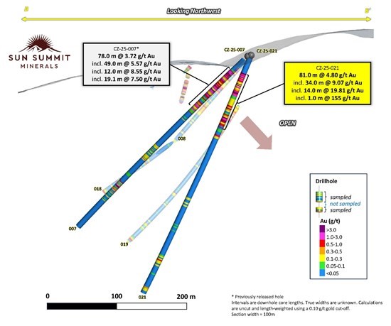 Drill hole CZ-25-021 was collared from the same pad as CZ-25-007 (78.0 meters of 3.72 g/t gold including 19.1 meters of 7.50 g/t gold, see news release dated September 8th, 2025), however it was swung to the southeast with a 230o azimuth and a steeper dip of -68o (Table 3). The pad is 75 meters to the north of hole CZ-24-004 (122.53 metres of 2.11 g/t gold including 4.04 metres of 46.78 g/t gold, see October 2, 2024 news release) and stepped out 100 meters west of hole CZ-24-005 (57.95 meters of 2.69 g/t gold including 19.50 meters of 7.31 g/t gold, see October 16, 2024 news release, Figure 1). The hole was designed to test the down-dip extent of gold mineralization intersected in drill hole CZ-25-007.