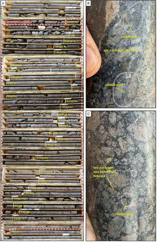 Figure 4. Core photos of CZ-25-021, A. Box photos showing core from 22.17 meters to 62.30 meters downhole which includes a broad interval of 34.0 meters of 9.07 g/t Au and two high-grade intervals of 155 g/t Au over 1.0 meter and 101 g/t Au over 1.0 meter. Individual down hole gold assay results are annotated at the sample depths. B. high-grade quartz-sulfide vein with visible gold at 54.1 meters down hole. C. sulfide-cemented hydrothermal breccia at 54.9 meters down hole with visible gold Abbreviations, qtz = quartz, carb = carbonate, sph = sphalerite, cpy = chalcopyrite.