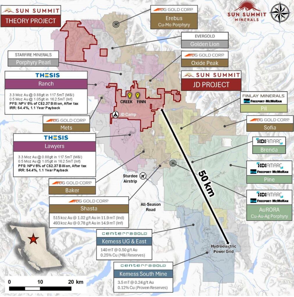The Theory Project borders Thesis Gold Inc.’s Ranch Project to the north and is located 10 km to the northwest of Sun Summit’s JD Project. Sun Summit has an exclusive option agreement with Eagle Plains Resources Ltd. to earn up to a 100% interest in the project, located in the highly prospective Toodoggone Mining District (for additional information on the Theory Project see the Company’s press release dated October 22, 2025).