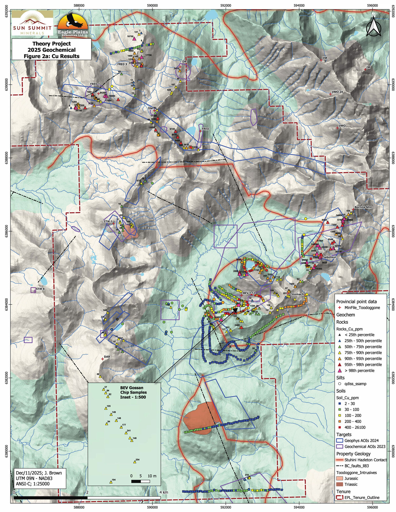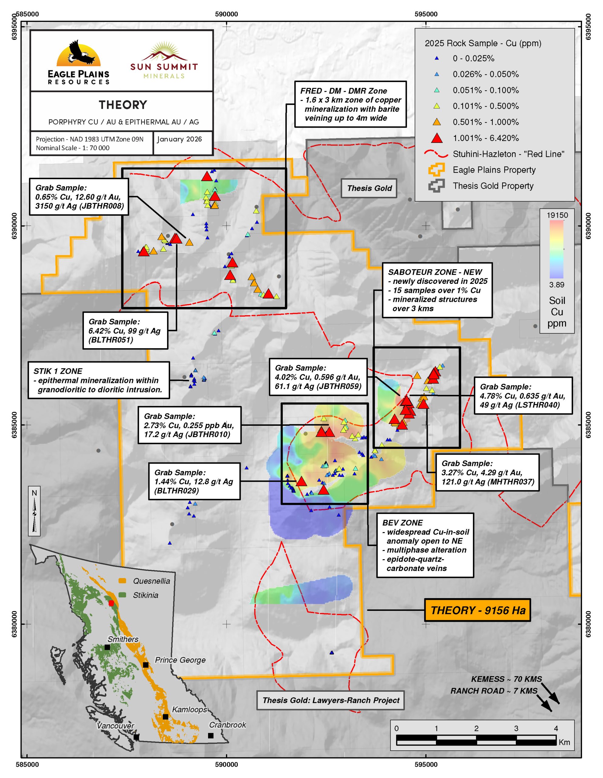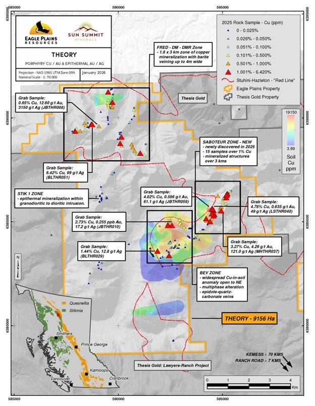 Mapping and sampling at the BEV zone has established significant scale potential which remains open in all directions across the corridor. More fieldwork is warranted in the 2026 exploration season to define future drill targets, and we look forward to continuing to work with Eagle Plains and Terralogic as we advance the Theory Project towards its first-ever inaugural drill campaign.”