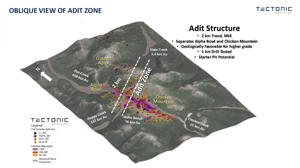 Figure 1: Oblique view of the Adit Structure relative to Alpha Bowl, Chicken Mountain, Golden Apex, the Placer Gold Production1, and the gold-in-soil anomalous areas: