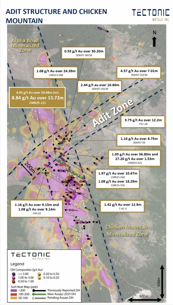 Tectonic Metals Inc. (TSX-V: TECT) (OTCQB: TETOF) today announced additional assay results from 11 drill holes completed during the 2025 drill campaign at Chicken Mountain and the Adit Zone, located within the Company’s flagship ~99,800 acre Flat Gold Project in Southwest Alaska.