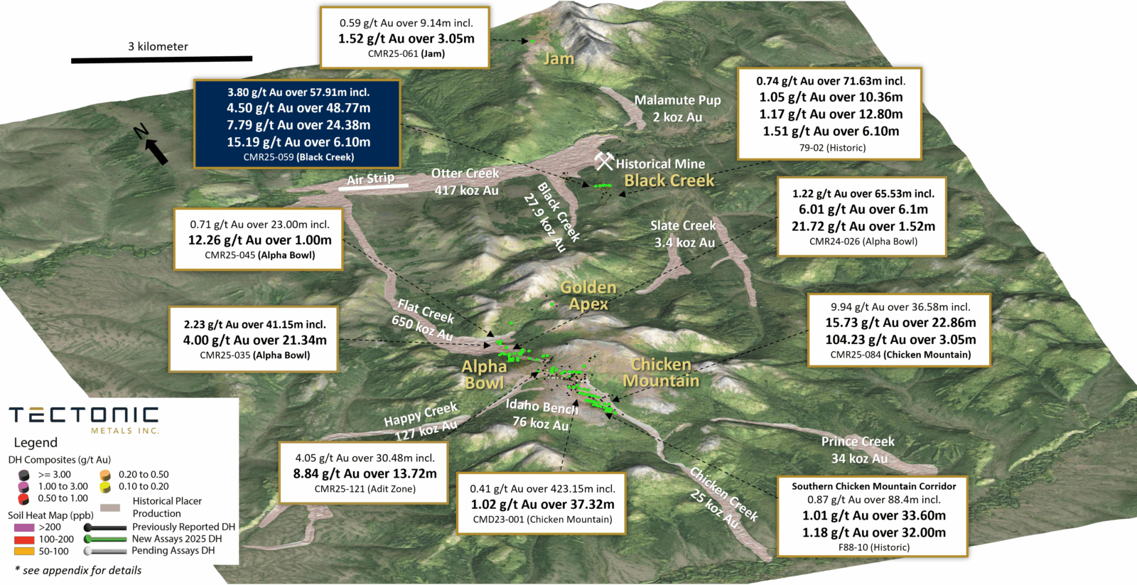 The Golden Apex is located approximately 1 km northeast of the Alpha Bowl target, believed to represent an unexposed intrusion situated in a favorable structural position between two known intrusions, Chicken Mountain and Black Creek.
