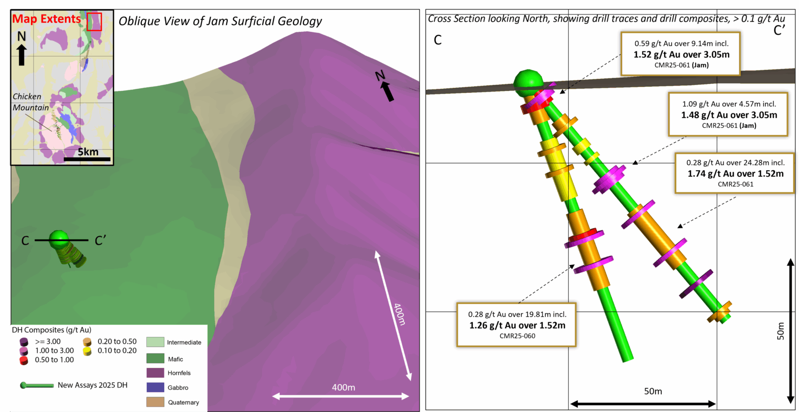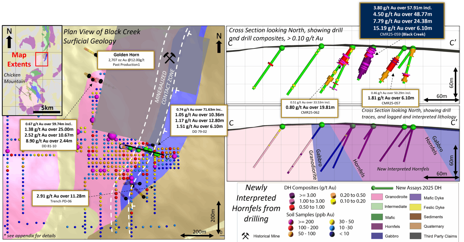 Our first pass drilling at Black Creek is transformative for several reasons. Hole CMR25-059 returned 4.50 g/t Au over 48.77 metres with 7.79 g/t Au over 24.38 metres beginning at surface, hosted in hornfelsed sediments along the intrusion margin. Importantly, this confirms high-grade gold in a fundamentally different host rock than the monzonite-dominant mineralization we have defined at Chicken Mountain and Alpha Bowl.