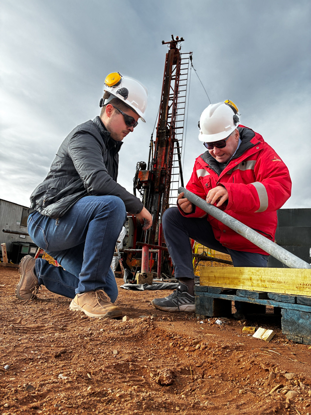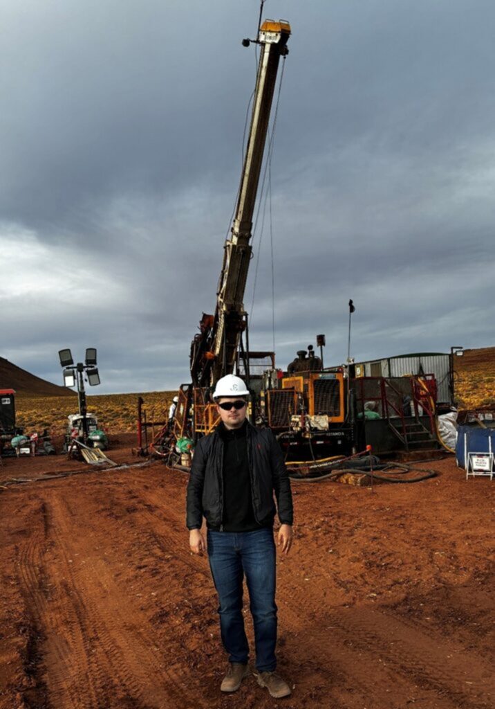 In front of the drill rig at JAC, where hole depth has ranged from 50 metres to 200 meters on average.