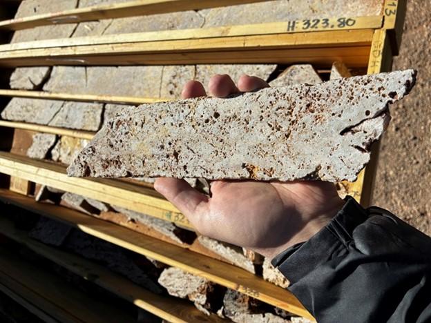 Laced with the Swiss-cheese–style vuggy silica alteration that often indicates high-grade gold, the sample in my hand comes from THAT 1 metre interval in Hole DDH-25-024, grading an astonishing 134 g/t gold at 325 metres downhole.