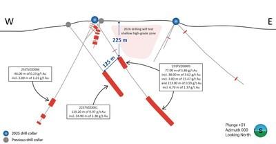 The 2025 drill program at the Steve Zone, consisting of five drill holes, was completed as an exploration follow-up to the high-grade gold discovery made in 2022 and expanded through drilling in 2023. Drilling focused on defining the continuity of mineralization and the relationship between localized high-grade gold and broader mineralized envelopes (Figure 1).
