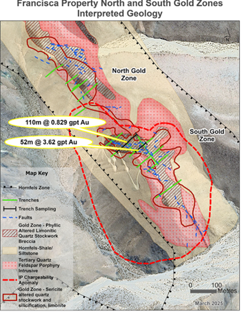 RM: The IP indicating a porphyry is very interesting, because you look at these intrusives, and as a huge heat source, you get the copper closer to the center, and then as you start moving out, gold falls out, and then distal would be the silver. Interestingly we have gold and silver both at Francisca.