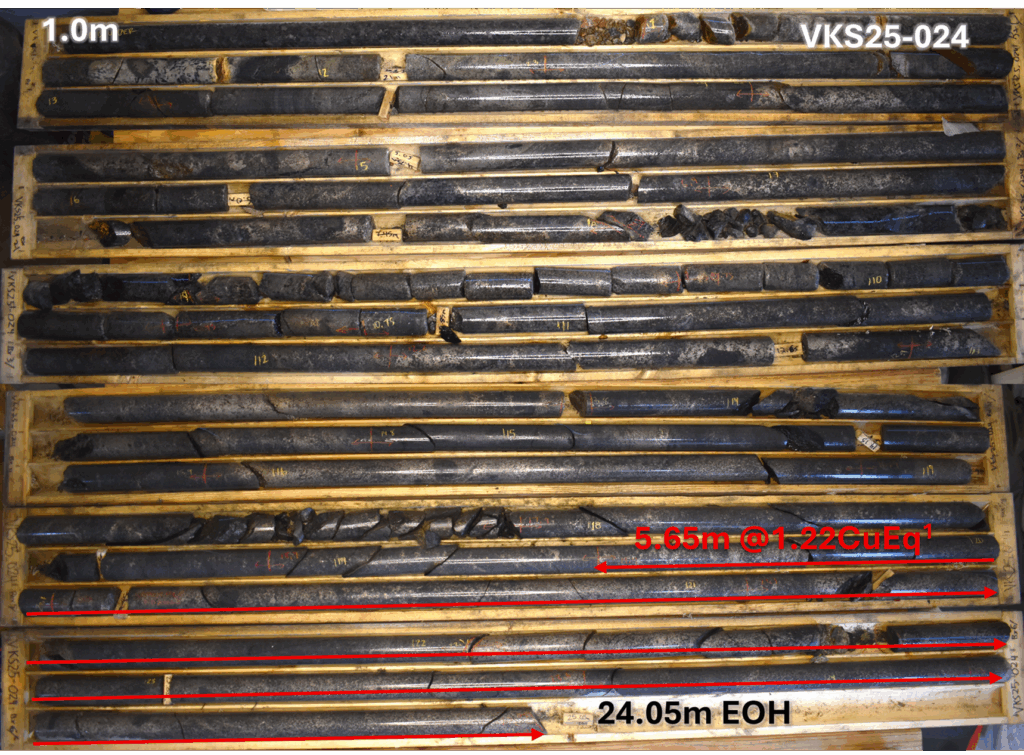 Figure 2: Hole VKS25-024 24.05m of 0.77% Cu Eq from 1m. Ending in 1.44% CuEq1 Net textured and Semi-massive sulfides for entire hole 1m to 24.05m