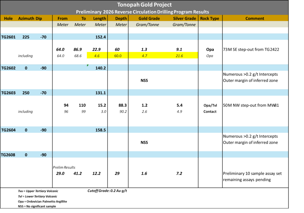 Viva Gold Corp (TSX-V: VAU) (OTCQB: VAUCF) is pleased to announce initial results from its 2026 reverse-circulation drill program, along with an update on pre-feasibility and baseline study activities at its Tonopah Gold Project in Nevada. Tonopah is 100%-owned by Viva and is located on the prolific Walker Lane Mineral Trend in western Nevada, approximately a 30-minute drive south of Kinross Gold’s Round Mountain Mine. Initial drill results have identified new areas of near surface, higher-grade mineralization, with additional assay results pending.