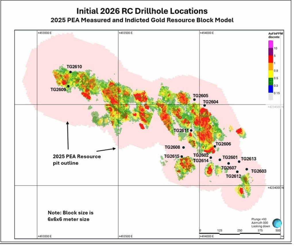 Fifteen drill holes totaling 2,407 m have been completed to date in the 2026 RC drill program. Assay results have been received for holes TG2601 to TG2604, and an initial 10-sample batch has been completed for TG2608, with remaining results pending. Turnaround times for assays have increased from approximately three weeks to five to six weeks. Initial highlights include: