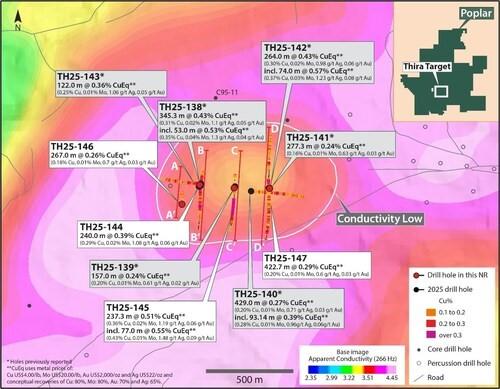 Figure 2. Map of the Thira target showing the location of holes TH25-144, 145, 146 and 147 with respect to all previously released drill holes. The area marked by the conductivity-low1 was the focus of drilling. See footnote below Table 1 for CuEq* calculation inputs. See references2,3 below for sources of historical drill data.