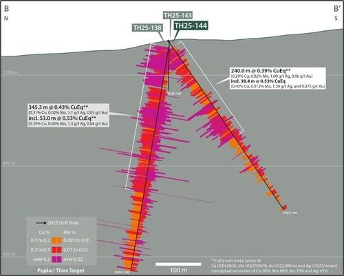 Figure 4. North-south section (8200 E, B-B’) showing copper and molybdenum assays down hole for drill holes TH25-138 and 144. See Table 1 and associated footnotes for CuEq metal and calculation inputs.