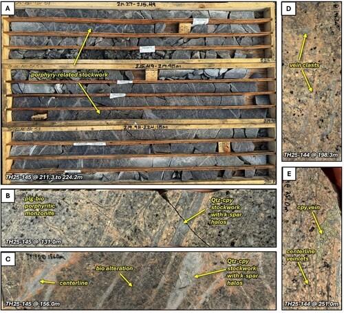 Figure 7. Core photos of TH25-144 and TH25-145. A. Box photos from hole TH25-145 from 211.3 to 224.2 meters down hole showing strong stockwork-controlled porphyry-related mineralization, B. porphyry-related quartz-chalcopyrite veins (A-type) with strong potassium feldspar halos cutting porphyritic monzonite from TH25-145 at 131.0 meters, C. porphyry-related quartz-chalcopyrite veins with local centerlines with strong potassium feldspar halos cutting biotite altered monzonite from TH25-145 at 156.0 meters, D. quartz vein clasts and wormy veins in intra-mineral biotite monzonite from TH25-144 at 198.3 meters, E. chalcopyrite-pyrite vein and fine quartz-feldspar veinlets cutting biotite porphyritic monzonite from TH25-144 at 251.0 meters. Abbreviations: qtz = quartz, cpy = chalcopyrite, bio = biotite, k-spar = potassium feldspar, plg = plagioclase.