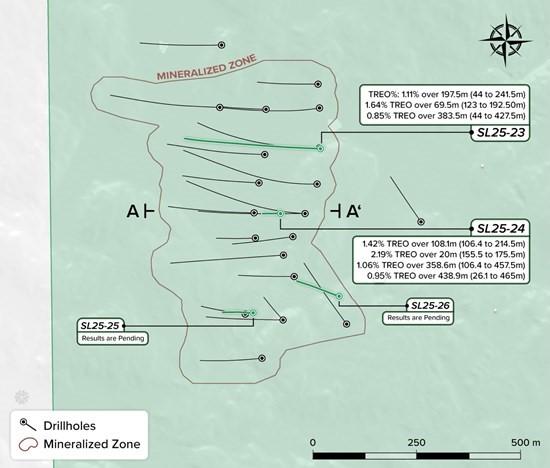 Borehole SL25-24 was drilled sub-vertical (at -85 degrees), to test the mineralization at depth below the historic resource estimate (Figure 2 and Figure 3). The drillhole returned significant mineralization, 0.95% TREO, over the entire sampled interval, to end-of-hole at 465m (Table 1).