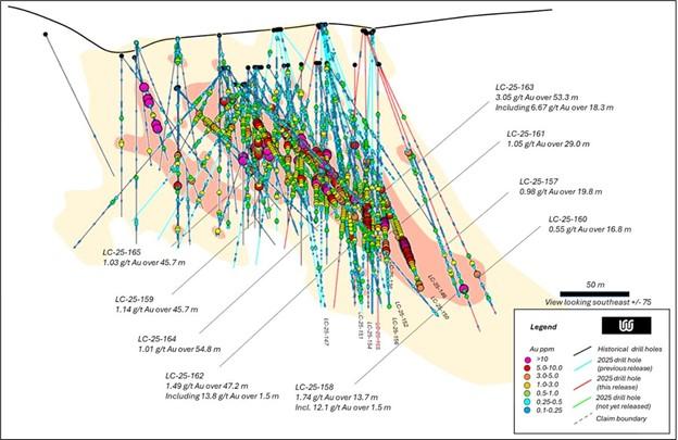 It is also notable that the gold encountered in drillholes LC-25-158 through 165 is hosted within monzonitic units. The presence of monzonite as the host rock suggests the potential for a monzonite porphyry system—deposit types that are associated with very large gold and copper-bearing systems in Nevada. Elevated copper values identified in the Company’s multi-element geochemical sampling further supports this interpretation.