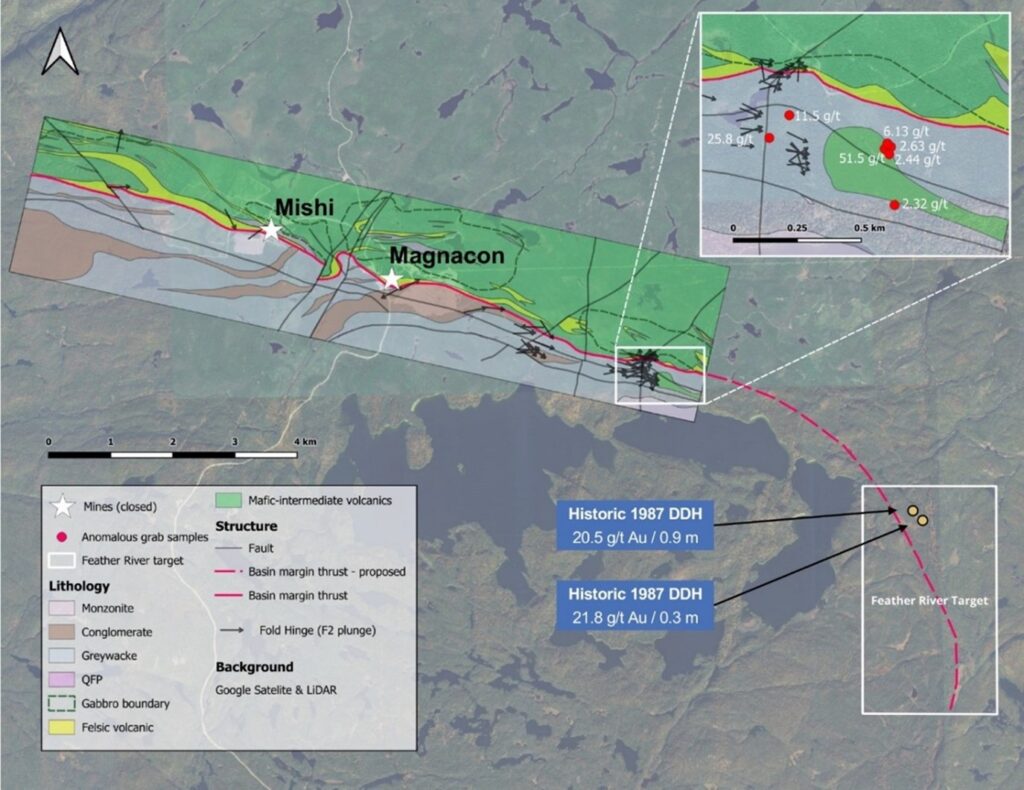 Notably, the known Mishi and Magnacon deposits sit within the metavolcanic package to the north of the structure, underscoring a compelling new exploration opportunity within the metasediments to the south. Newly collected grab samples from the 2025 field season, taken south of the basin margin contact, and within the metasedimentary package, four kilometres to the east of the Magnacon deposit, returned anomalous values of up to 51.5 g/t, further reinforcing the untapped potential of this setting.