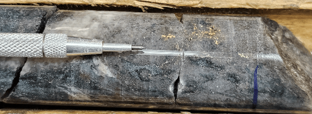 Figure 1. Visible gold showing in hole MM25D-12-4860-031 at 50.05m downhole depth.