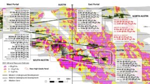 The drill results featured in this news release are focused on the high-grade Austin Zone, which currently contains an Indicated mineral resource of 914,200 ounces grading 6.9 grams per tonne gold, with an additional Inferred resource of 104,900 oz grading 6.5 g/t Au.